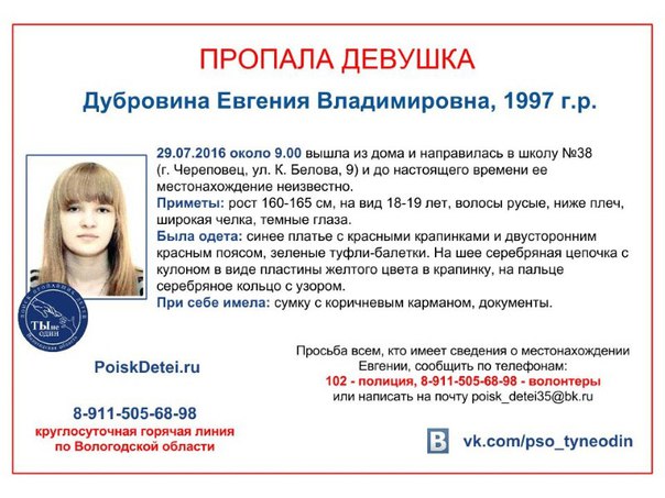 Напомним, что Евгения Дубровина пропала 29 июля в Череповце. Около 9:00 она вышла из дома и направилась в сторону школы №38 на Командарма Белова, 9, сообщает ИА «СеверИнформ».