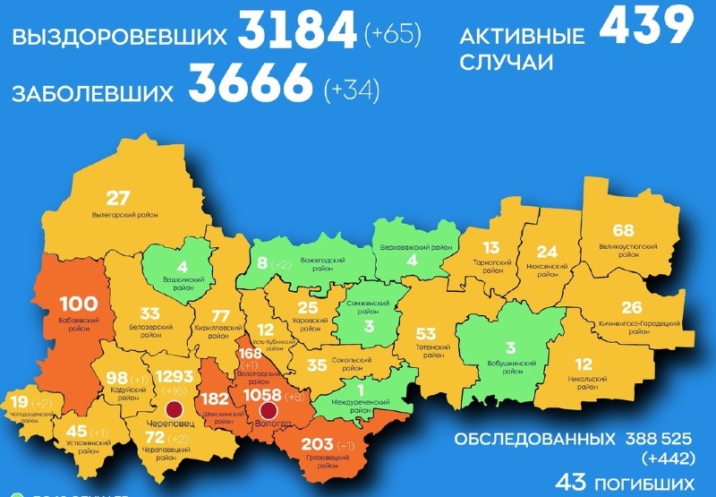 По данным на 8 сентября на Вологодчине выздоровело 65 человек. Всего за время пандемии справились с инфекцией 3 184 человека. На данный момент в регионе 3 666 подтвержденных случаев коронавирусной инфекции. За прошедшие сутки 34 новых случая: 16 – Череповец, 8 – Вологда, по 2 в Вожегодском, Чагодощенском и Череповецком районах, по одному случаю в Грязовецком, Вологодском, Устюженском и Кадуйском.