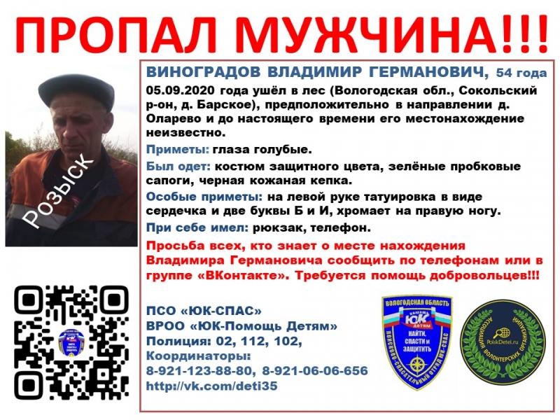 54-летний мужчина пошел в лес предположительно в направлении деревни Оларево 5 сентября. В последний раз он выходил на связь с родными 6 сентября. До сих пор местонахождение пропавшего неизвестно. Ситуация осложняется тем, что у мужчины больная нога, возможно, ухудшение самочувствия. Поисками занимаются спасатели, полицейские, волонтеры. Есть потребность еще в добровольцах, пишет ПСО "Ты не один".