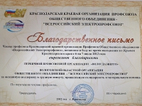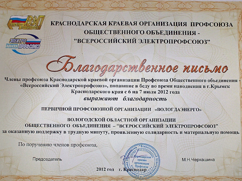 В официальном письме за подписью Председателя Марины Черкашиной, коллеги поблагодарили Первичную профсоюзную организацию «Вологдаэнерго» Вологодской областной организации общественного объединения – «Всероссийский электропрофсоюз» «за оказанную поддержку в трудную минуту, проявленную солидарность и материальную помощь».