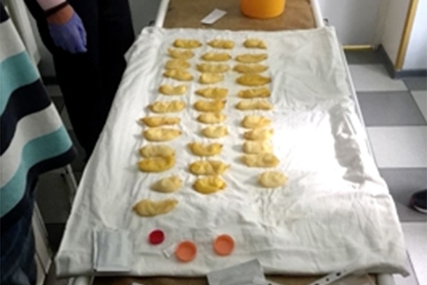 При прохождении досмотра рентгеноскопическое исследование показало инородные тела в желудочно-кишечном тракте. Поэтому пассажиров направили в медицинский стационар, где извлекли у них 100 контейнеров с кокаином. Груз потянул на 961 грамм.