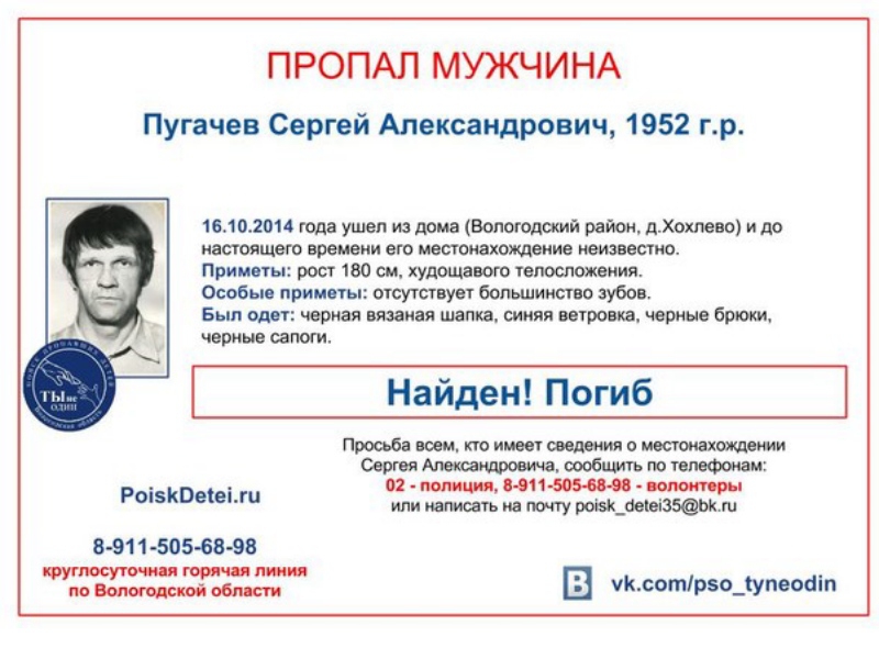 Сергей Пугачев ушел из дома в середине октября. Известно, что он проживал в деревне Хохлево Вологодского района. Несколько месяцев о нем ничего не было известно.