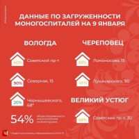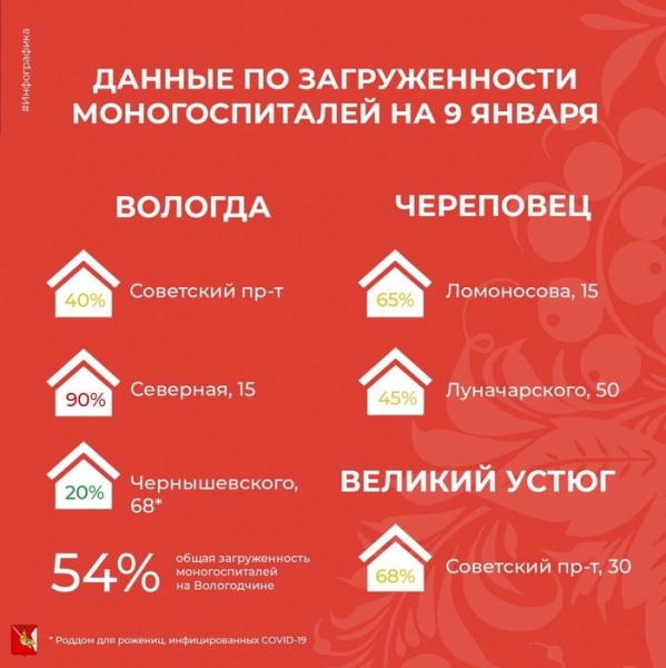 Как информирует оперативный штаб региона, по состоянию на 9 января, самый крупный моногоспиталь Вологды, что на Советском проспекте, заполнен лишь на 40%. В моногоспитале на Северной, где в общей сложности 150 мест, свободны только 10%. Практически пустует роддом для рожениц с ковидом. На сегодня в нем заняты 20% мест.