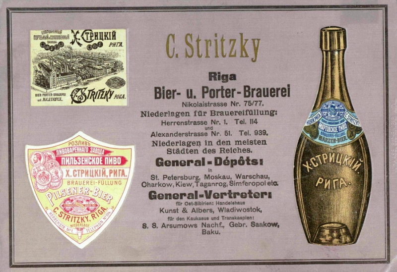 «Дело в том, что эта стеклянная пивная бутылка была изготовлена в конце XIX – начале XX века на заводе Стрицкого в Риге. Об этом нам сообщает рельефная надпись по центру тулова. Кристиан Карл Кристоф фон Стрицкий – представитель третьего поколения Стрицких в Риге, основавший в 1854 году предприятие, которое было названо «Пивоварней Стрицкого». Свой современный вид фабрика приобрела к 1908 году, когда появилась вторая динамо-машина, возведена новая солодовня и электрическая сушилка. Таким образом пивоварня была одной из самых передовых в своей отрасли не только в России, но и в Европе. На заводе Стрицкого производили пиво, портер и другие солодовые напитки. Со временем фабрика освоила пивоварение по пильзенскому, баварскому и мюнхенскому рецептам. Продукцию фабрики продавали не только в Прибалтике. Свои представительства были у Стрицкого в Петербурге, Москве, Варшаве, Киеве, Баку, Симферополе и во Владивостоке. Продукция фирмы не раз получала высшие награды на выставках в России и Европе».
