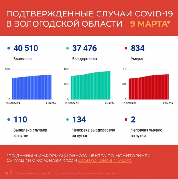 134 человека в подтверждение своего выздоровления накануне получили отрицательные тесты. Всего ковид побороли 37 476 вологжан. За сутки зарегистрировали две смерти от коронавируса. Всего 834 жизни унес ковид за год пандемии.