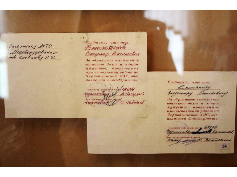 В экспозицию вошли фотографии и личные документы ликвидаторов последствий аварии на АЭС, медали, благодарности, грамоты, пропуски на право въезда в закрытую зону.