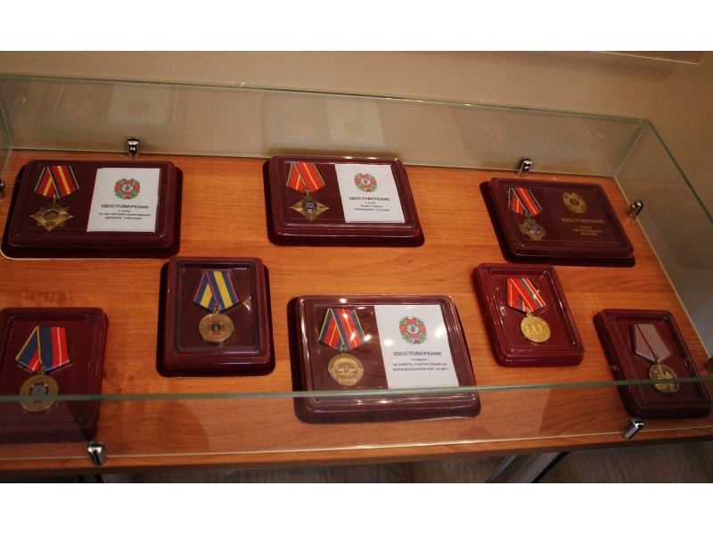 На выставке показаны медали, благодарности, грамоты, пропуски на право въезда в закрытую зону, книги ликвидаторов аварии