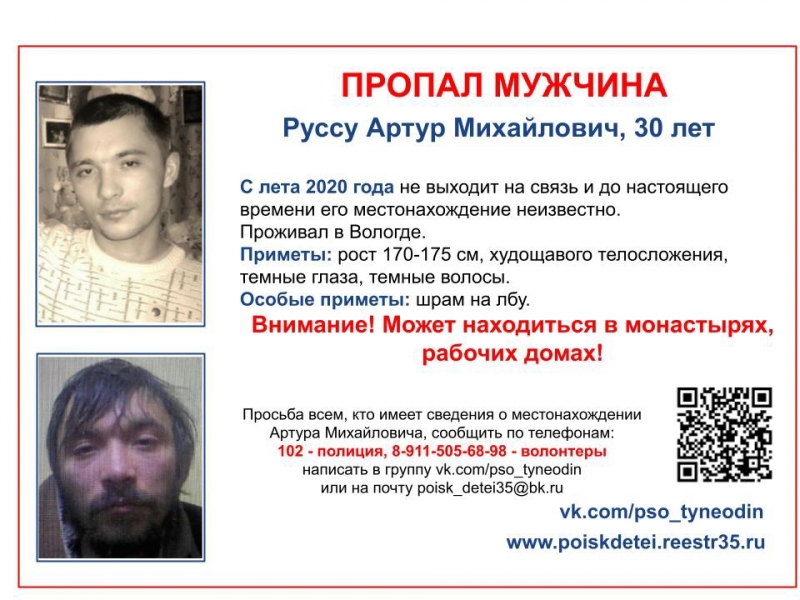 30-летний Артур Руссу не выходит на связь с прошлого лета. До сих пор местонахождение мужчины не установлено. Предположительно может находиться в монастырях, рабочих домах. Такую информацию распространяет ПСО "Ты не один".