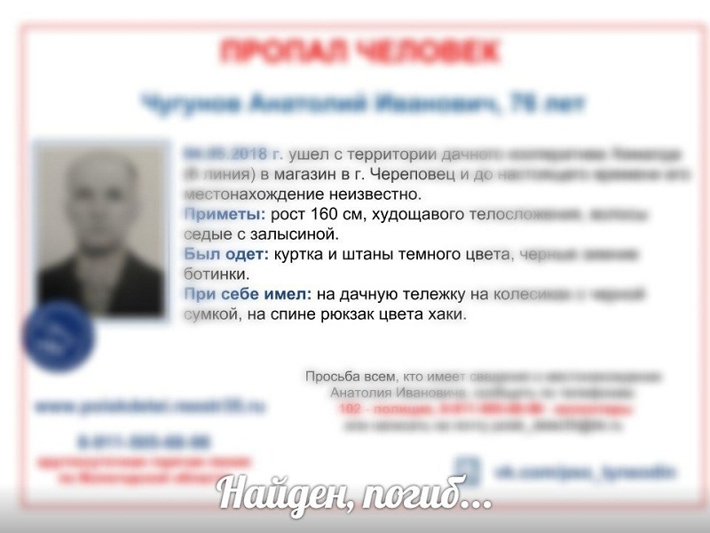 Напомним, пожилой мужчина бесследно исчез 4 мая, когда ушел в магазин в Череповец из дачного кооператива Хемалда на 6-й линии, сообщает ИА «СеверИнформ».