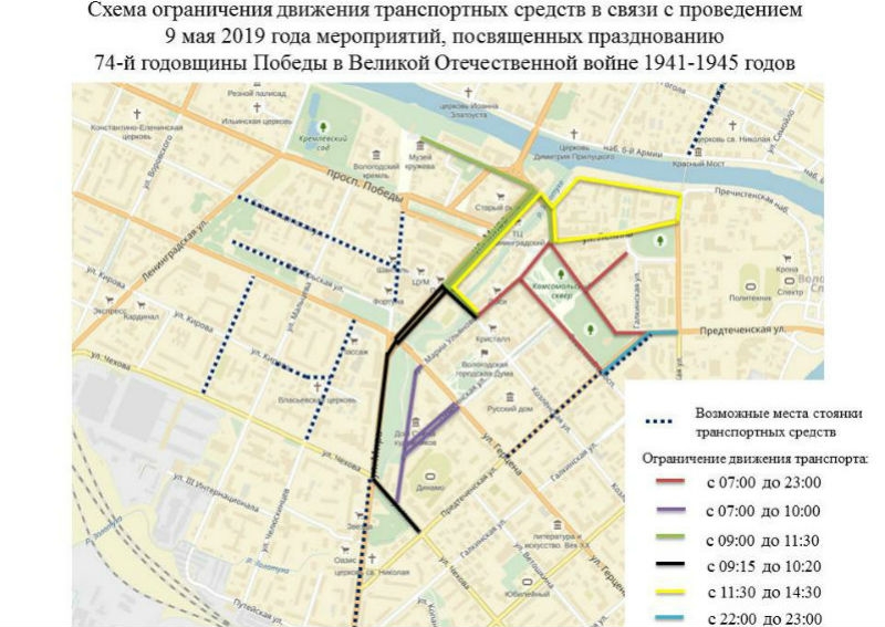 В связи с этим движение транспорта на центральных улицах Вологды 9 мая будет ограничено. С 7 утра до 23 вечера будет закрыто движение для автомобилей по Советскому проспекту на участке от улицы Предтеченской до улицы М. Ульяновой; по площади Возрождения; по улице Лермонтова на участке от улицы Ленина до улицы Предтеченской; по улице Пушкинской на участке от улицы Лермонтова до улицы Галкинской; по улице М. Ульяновой на участке от улицы Козленской до Советского проспекта.