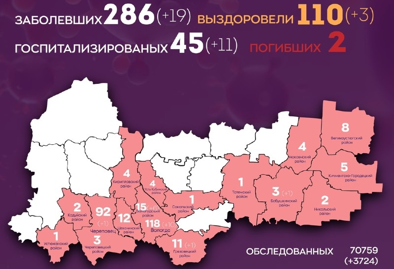 Выздоровевших – 110 (+3), на госпитализации – 45 (+ 11), погибших – 2 (Великоустюгский район, г. Вологда), количество обследованных – 70759, сообщает ИА "СеверИнформ".