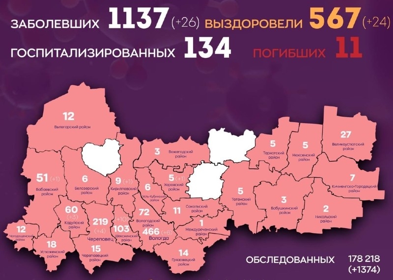 Статистика на прошедшие сутки: в Вологодской области 1 137 подтвержденных случаев коронавирусной инфекции, за сутки 26 новых случаев: 6 – Вологда, 4 – Череповец, 10 – Шекснинский район, 3 – Кадуйский район, 1 – Кирилловский район, 1 – Харовский район, 1 – Бабаевский район.