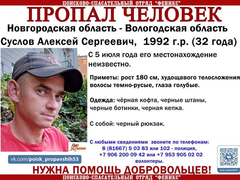 Алексея Суслова разыскивают на территории сразу двух областей. Предположительно, он может быть в Вологодском или Новгородском регионе.