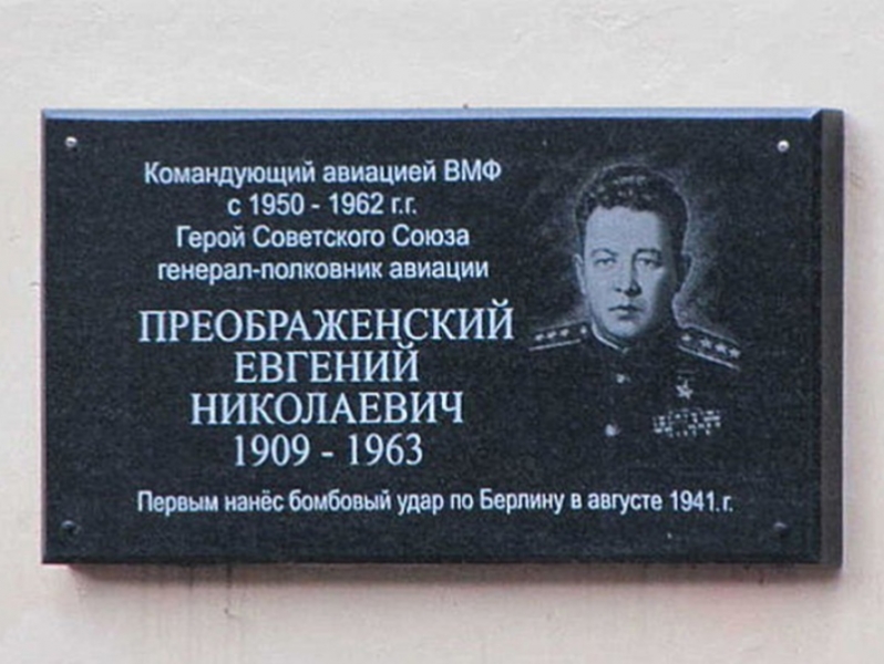 Евгений Преображенский был командующим специальной авиационной группой во время Второй Мировой, участвовал в первой бомбардировке Берлина в августе 1941 года и в освобождении Порт-Артура в августе 1945, прошел всю войну и был удостоен высокого звания Герой Советского Союза.