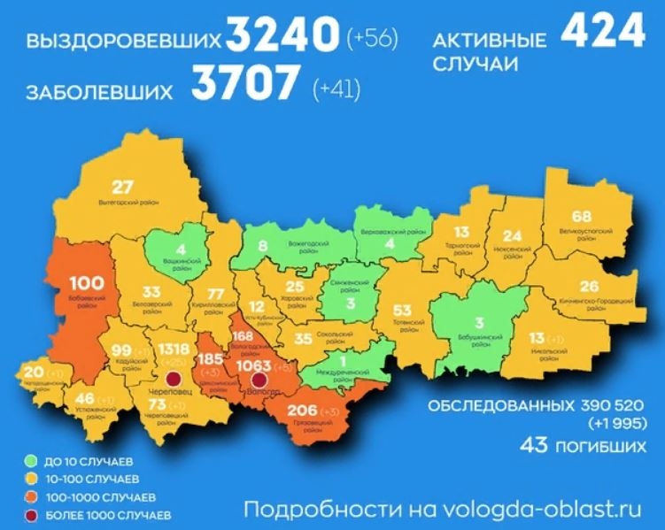 За сутки диагноз подтвердился у 25 человек в Череповце, 5 - в Вологде, 3 в Шекснинском и Грязовецком районах. По одному случаю прибавилось в Череповецком, Никольском, Кадуйском, Устюженском и Чагодощенском районах. С начала пандемии 3707 заболевших коронавирусом.