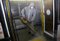В автоколонне № 1456 автобусы обрабатывают после каждой смены. Машины дезинфицируют при помощи парогенератора. На каждую уходит по 5-8 минут. Раствором обрабатываются пол, стены, поручни, подножки. Делают это люди в специальных костюмах.