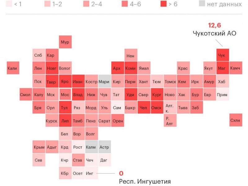 Лидерами по смертности из-за алкоголя стали дальневосточные регионы - Чукотка и Магаданская области. Здесь показатели достигли порядка 13 и 10 человек на 10 тысяч жителей. В Ивановской и Новгородской областях показатели составляют около 9.