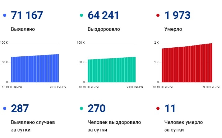 Общее количество заболевших превысило 71 тысячу человек. Выписали с больничного 270 человек, всего – более 64 тысяч пациентов. Скончались еще 11. Число жертв выросло до 1973. Таковы официальные данные на утро 9 октября.