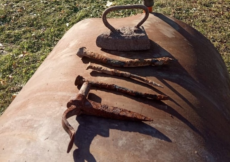 Необычные артефакты Александр Зимин находит на своем дачном участке. Только за эту неделю удалось обнаружить несколько находок. В их числе внушительных размеров гвозди, орудия труда и даже утюг.