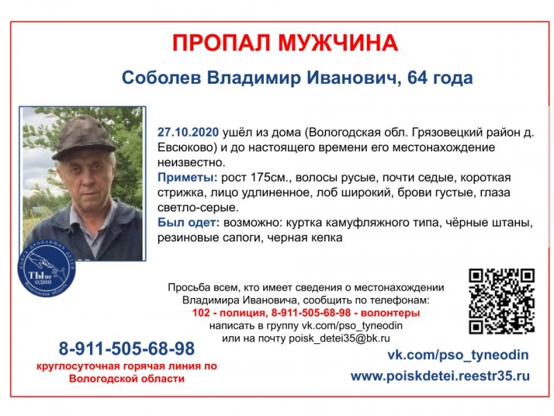 64-летний Владимир Соболев ушел из деревни Евсюково в неизвестном направлении. Это произошло еще 27 октября. Где сейчас находится мужчина, неясно. Информацию о поиске распространяют волонтеры ПСО "Ты не один".