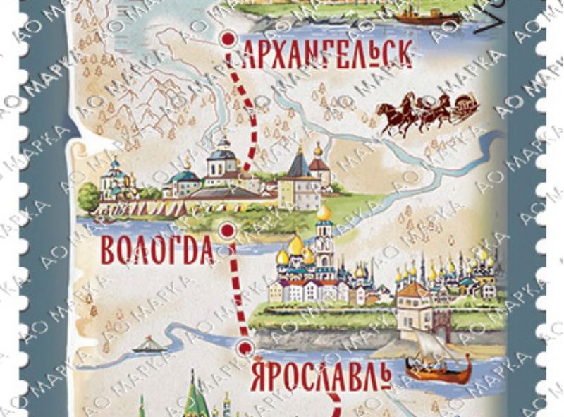 На марке изображен Холмогорский тракт, по которому перевозили почту еще в XV веке. Он соединяет Архангельск, Вологду, Ярославль и Москву.