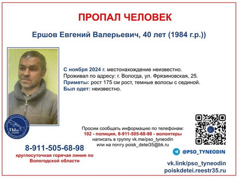 Евгению Ершову 40 лет. Он жил в Вологде на улице Фрязиновской. Волонтеры отряда «Ты не один» уже несколько месяцев ищут этого человека. Известно про него очень мало: рост 175 см, темные волосы с сединой. Во что был одет, не известно.