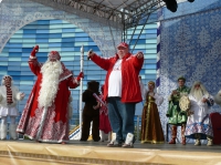 Российского Деда Мороза. Популярный автор и исполнитель песен вместе с зимним волшебником поднялись на сцену, установленную в Резиденции сказочного персонажа, и вместе исполнили г