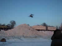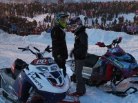 На Экстрим-фестивале у Деда Мороза в Великом Устюге в субботу, 10 марта, выступили мировые звезды фристайл-сноукросса - шведы Маркус Нордин и Андерс Эрикссон. Это один из самых экстримальных видов спорта. Суть его в том, что снегоход разгоняется, отталкивается от трамплина, выпрыгивает на 10-13 метров вверх, пролетает несколько десятков метров и приземляется на наклонную поверхность. Спортсмены вдвоем устроили для устюжан и гостей города настоящее шоу, сообщает ИА "СеверИнформ - Новости Вологодской области".