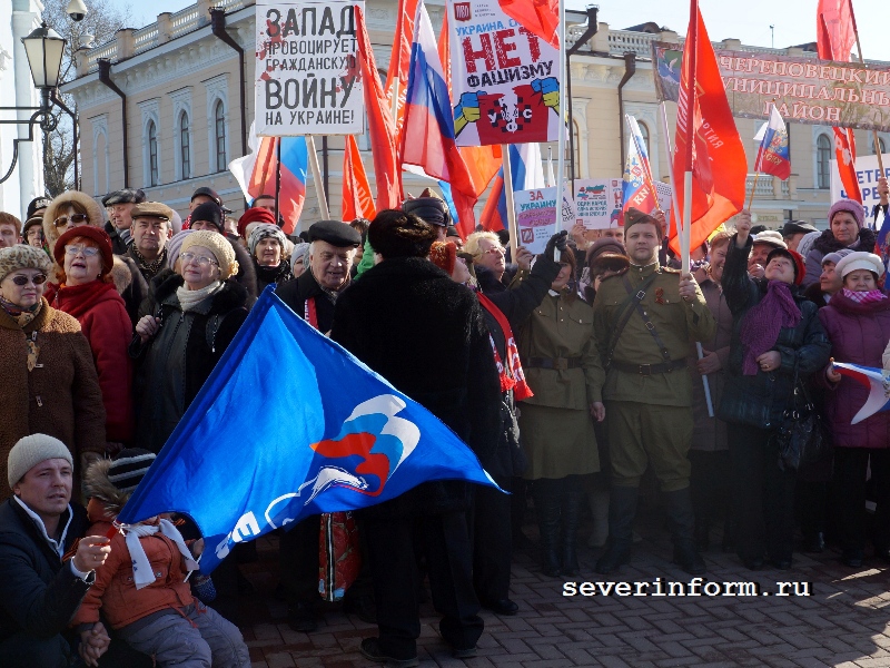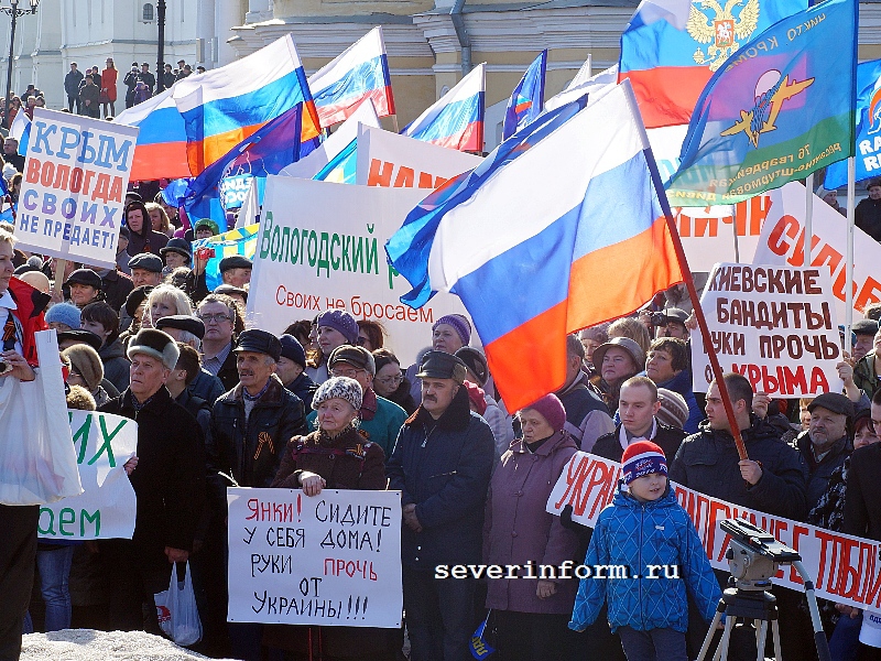 Пять с половиной тысяч вологжан собрались на митинг в поддержку русскоязычных жителей Украины. Кремлевская площадь в понедельник, 10 марта, была наполнена до отказа. В мероприятии приняли участие представители общественных организаций, политических партий, общественных советов городов и поселений, движения «Общероссийский народный фронт» и других объединений. Мероприятие состоялось по инициативе Городского совета ветеранов при поддержке Общественной Палаты Вологодской области.