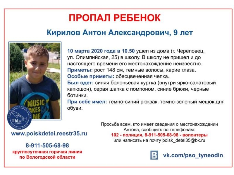Тех, кто видел Антона, просят обращаться в полицию или по телефону 89115056898, сообщает ИА «СеверИнформ».