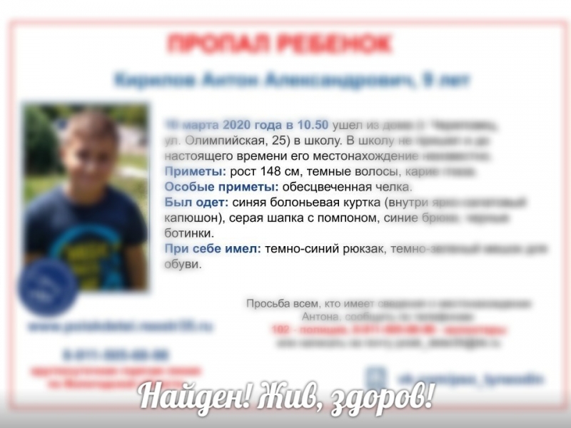 Ранее в сообществе говорилось, что пропал 9-летний Антон Кирилов. Утром 10 марта он должен был пойти в школу, но на занятиях не появился и домой не вернулся. Спустя несколько часов обеспокоенные родители объявили мальчика в розыск.