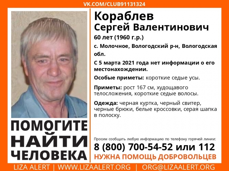 60-летний Сергей Кораблев живет в Молочном. С 5 марта нет данных о местонахождении мужчины. ПСО "Лиза Алерт" распространяет информацию о поиске.