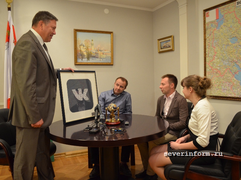 На память о встрече Олег Кувшинников подарил гостям логотип «ВКонтакте», сплетенный из традиционного вологодского кружева.