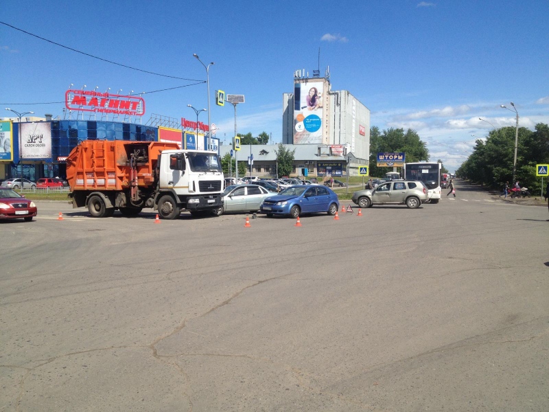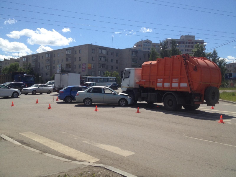 Chevrolet, проезжая перекресток, столкнулся с машиной Lifan, а та - с мусоровозом