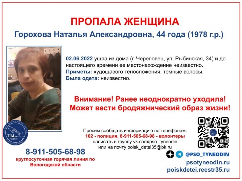 Известно, что женщина худощавого телосложения, с темными волосами. Раньше уже не раз уходила из дома, может вести бродяжнический образ жизни.