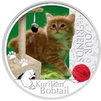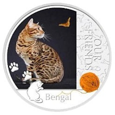 В Северный банк Сбербанка России поступили драгоценные монеты из серии «Наши друзья», посвященные трем породам кошек. На реверсе каждой из монет изображена одна из трех пород: шотландская вислоухая, бенгальская и курильский бобтейл. В правой нижней части, на фоне изображения резвящихся кошек, указано название серии – «Our frends». В нижней части выгравировано название монеты и силуэт умывающейся кошки.