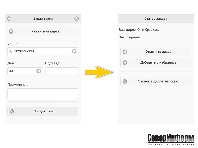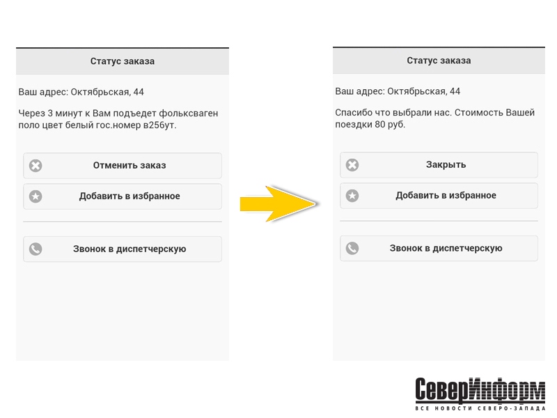 А вот здесь настало время удивляться. Скорость действительно, поразительная. Лично по нашему опыту информация о выехавшей машине пришла сразу. К слову, мы делали заказ на улицу Октябрьскую c телефона HTC на платформе «Android». В этом же приложении вам приходит информация, как только машина подъедет.