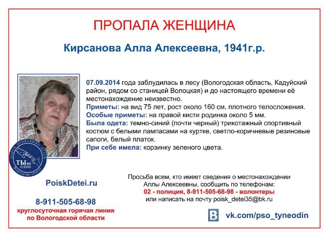 Напомним, что 73-летняя Алла Кирсанова потерялась 7 сентября. Она ушла в лес неподалеку от станции Волоцкой Кадуйского района. Когда пенсионерка вовремя не вернулась, родственники обратились в правоохранительные органы. К поискам присоединились волонтеры.
