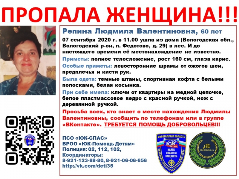 Женщина полного телосложения, ростом 160 сантиметров. Есть левосторонние шрамы от ожогов на шее, предплечье и кисти руки. Была одета в темные штаны, спортивную кофту с белыми полосками, белую косынку. К поисками подключились волонтера.