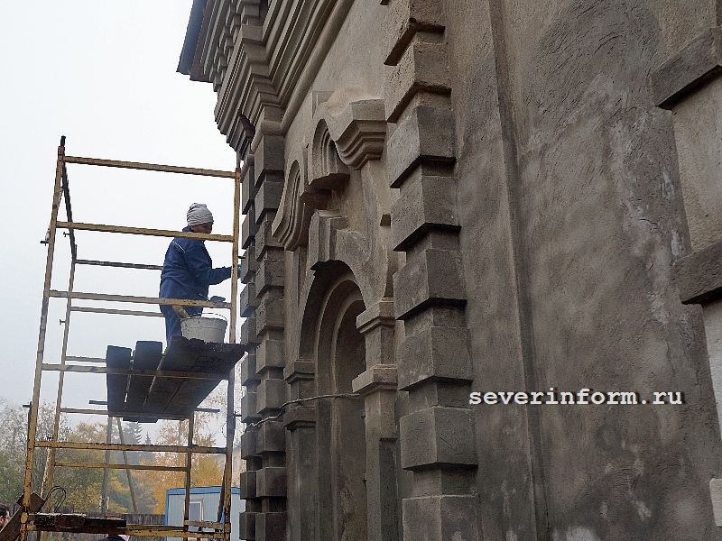 «Сейчас в храме очень приятно. Но раньше здесь были зияющие дыры, на стенах березы росли, практически не было стен — они превратились в труху. Здесь было приспособление под цеха макаронной фабрики, что плохо сказалось на конструкции стен. Наличники разбиты и изуродованы. Каменщик восстанавливает декор», - рассказала Елена Никитина.