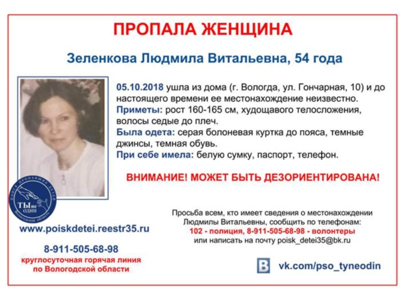 Всех, кто что-то знает о местонахождении Людмилы Зеленковой, просят позвонить по телефону полиции 102, либо на «горячую линию» волонтеров ПСО: 8911-505-68-98, также можно написать на электронную почту poisk_detei35@bk.ru, сообщает ИА «СеверИнформ».