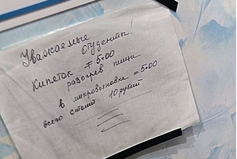Столовая предлагает отдельный прейскурант на стакан кипятка и минутный подогрев еды в микроволновке. Каждая услуга стоит 5 рублей, пишет портал «В точку». На подобный «сервис» тут же обрушились критические замечания. По мнению большинства пользователей Интернет, работники учреждения нарушили общепринятое правило этики, согласно которому стакан воды и подогрев – это элементарные вещи, которые делаются бесплатно. Причём не только в студенческих столовых, но и кафе.