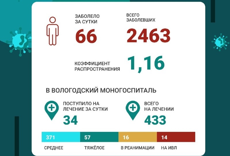 Накануне в Вологде выявлено 66 новых случаев COVID-19, всего на сегодня в областной столице 2 463 заболевших инфекцией.