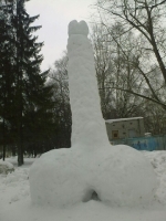 В Октябрьском сквере областной столицы неизвестные слепили фаллос из снега. Столь необычное сооружение, как сообщает корреспондент ИА СеверИнформ - Новости Вологодской области, возвели рядом с памятником «Побег из ада», посвященным 65-летию Победы над фашизмом. Длина «скульптуры» около четырех метров. Неподалеку от нее также из снега сделали крепость, зайчика и улыбающуюся гусеницу. Только простоял слепленный фаллос всего несколько часов: приехавшая на место бригада «Зеленстроя» оставила от него лишь сугроб. Будет ли «скульпторами» заниматься милиция пока не известно. Но, как рассказали в пресс-службе областного УВД, этот случай может расцениваться как мелкое хулиганство, за которое грозить штраф в размере от 5 до 15 минимальных заработных плат.