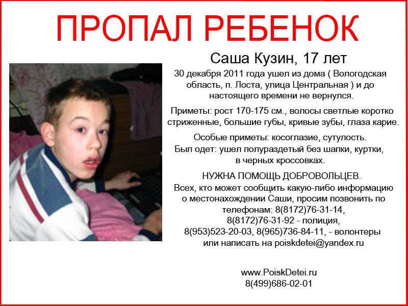 17-летний подросток Александр Кузин, проживающий в поселке Лоста в Вологде, пропал в конце 2011 года. Согласно информации, размещенной в группе в социальной сети «ВКонтакте», посвященной его поискам, Саша ушел из дома 30 декабря, и до сих пор о его местонахождении ничего неизвестно, сообщает ИА «СеверИнформ — Новости Вологды».