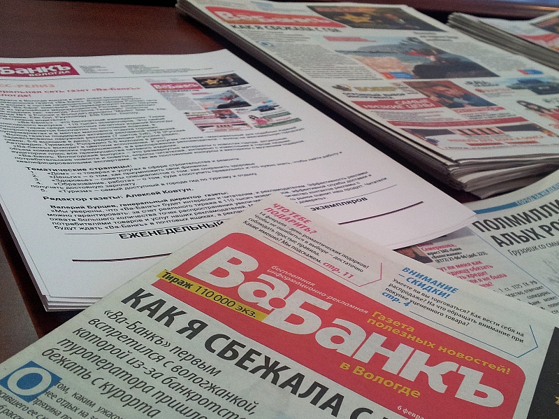 В Вологде появилось новое печатное издание под известным федеральным брендом "Ва-банкъ". Оно позиционируется как бесплатная информационно-рекламная газета полезных новостей. При этом издатели стартовали сразу с больших объёмов: как сообщает ИА "СеверИнформ - Новости Вологды", тираж первого выпуска в областной столице составил 110 тысяч экземпляров.