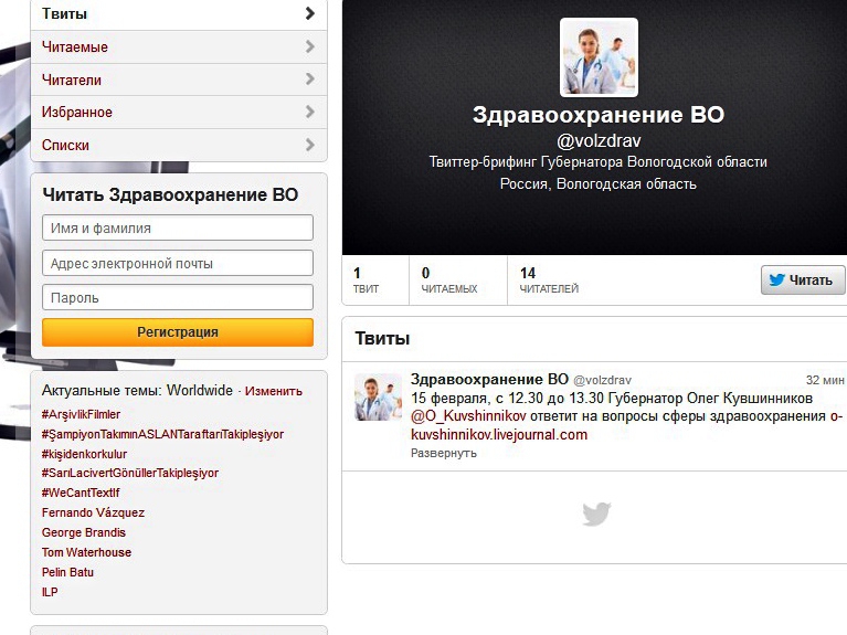 Вопросы сферы здравоохранения станут темой первого твиттер-брифинга губернатора Вологодской области. Мероприятие состоится 18 февраля. Об этом сообщает ИА «СеверИнформ — Новости Вологодской области» со ссылкой на пресс-службу главы региона. В течение часа — с 12:30 до 13:30 — губернатор области будет отвечать на предложенные вопросы. Их можно оставить, начиная с 11 февраля, на специально созданной странице - https://twitter.com/volzdrav. В дальнейшем подобные беседы планируется проводить регулярно.
