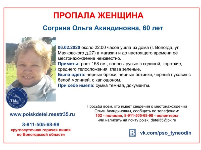 60-летняя Ольга Согрина ушла из дома в магазин около 22 часов 6 февраля. Женщина живет на Маяковского, 27. До сих пор местонахождение неизвестно. Сейчас к поискам подключились волонтеры.
