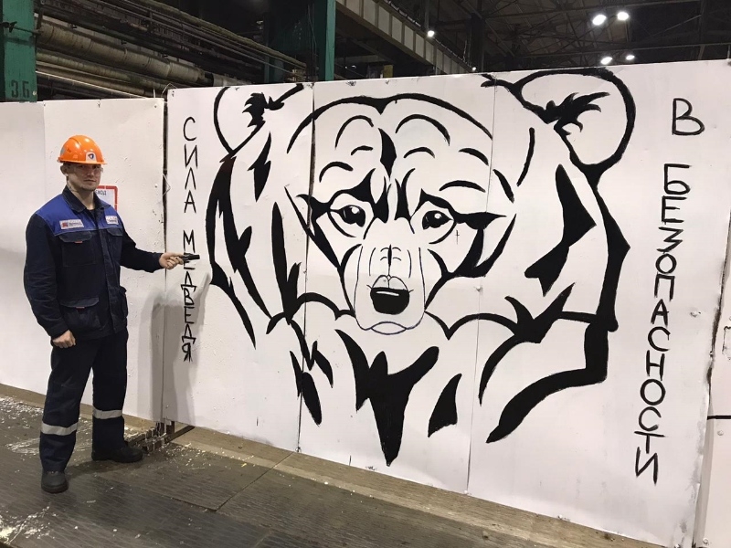 В роли арт-объекта выступил серый забор в цехе отделки металла №3. Сейчас там строится новый агрегат порезки рулонов. Забор вдоль нового оборудования работники предприятия украсили граффити на тему правил охраны труда.