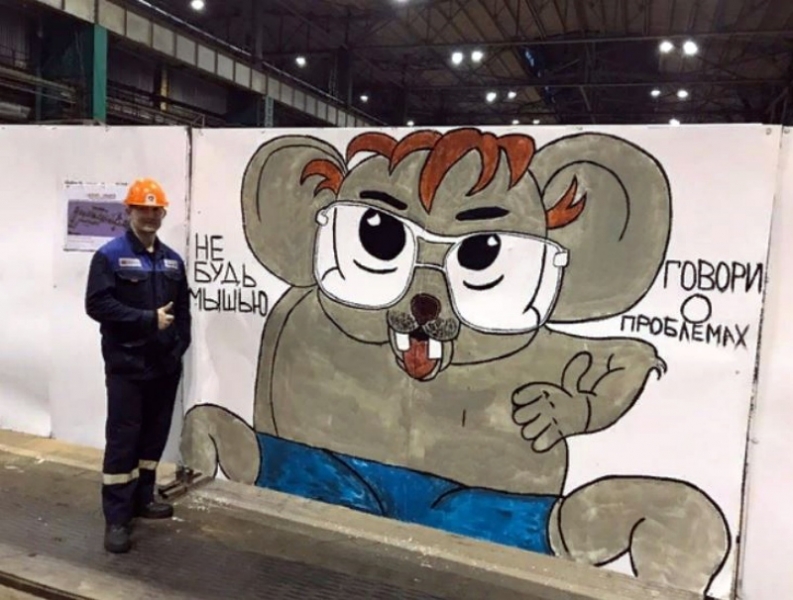 Автором идеи стал начальник цеха Сергей Якушев, а воплотил задумку в жизнь резчик холодного металла Кирилл Пудовиков с помощью бригадира отгрузку Сергей Тимофеев. Над созданной баллончиками иллюстрацией сотрудники трудились около недели.